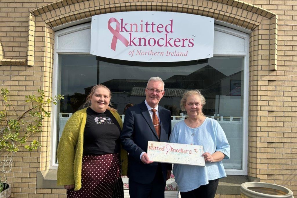Picture (l-r) are Hope Graham, Health Minister Mike Nesbitt and Joanne Harris pictured at the new Knitted Knockers NI base in LurganThis week Health Minister Mike Nesbitt visited the organisation at its new offices in Lurgan, where he commended the breast cancer support it provides as it celebrates its tenth year in operation.