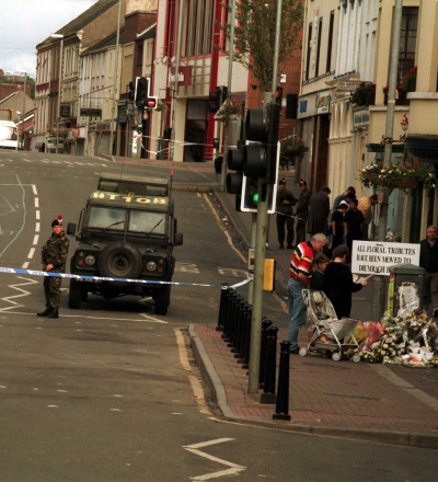 Flowers left at the scene were the bomb exploded at the shops in Omagh Town (Pic Photocall Ireland)The Inquiry opened in January 2025 with the first oral hearings from survivors and those directly affecting by the bombing in Omagh, Co. Tyrone.