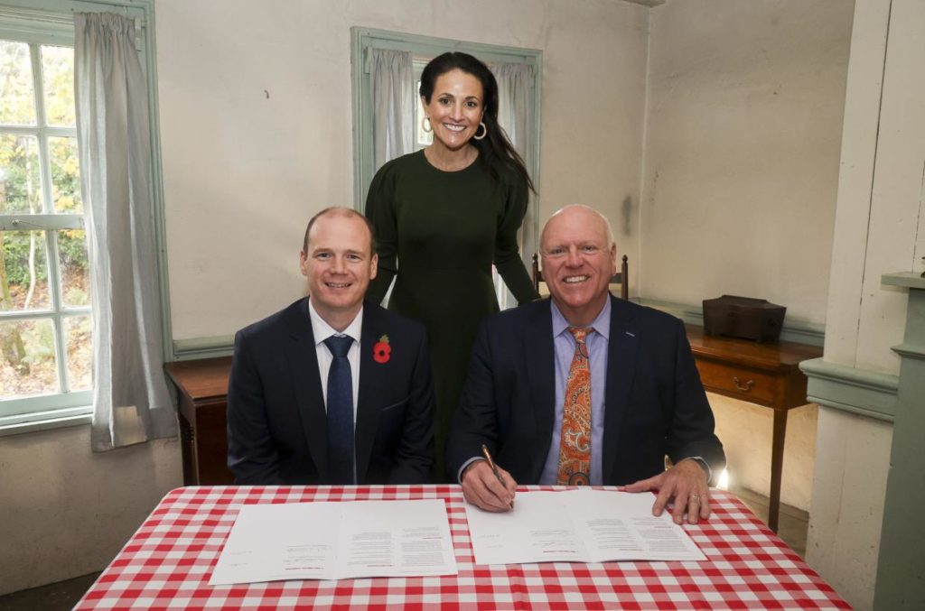 Communities Minister Gordon Lyons, America250 Executive Vice President Jen Condon and America250 Commissioner Joe Crowley at the signing of the Memorandum of Understanding at the Pennsylvania Log Farmhouse at the Ulster American Folk ParkThe Minister recently launched the USA-NI250 Fund which will provide financial support for a wide range of celebratory projects including community events, cultural exhibitions, educational programmes and storytelling to reflect the shared history and links between Northern Ireland and the United States.