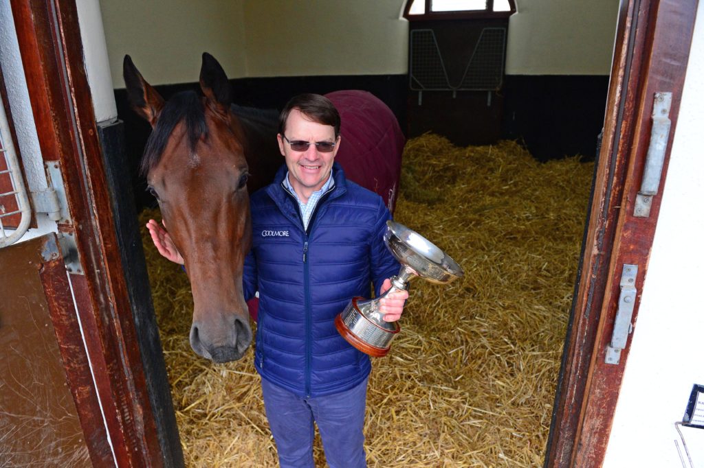A delighted AIDAN O'BRIEN pictured with the trophy for Champion Flat Trainer 2020, his 23rd time to achieve the feat . Also pictured is VAN GOGH in his stable admiring the trophy (Photo Healy Racing)