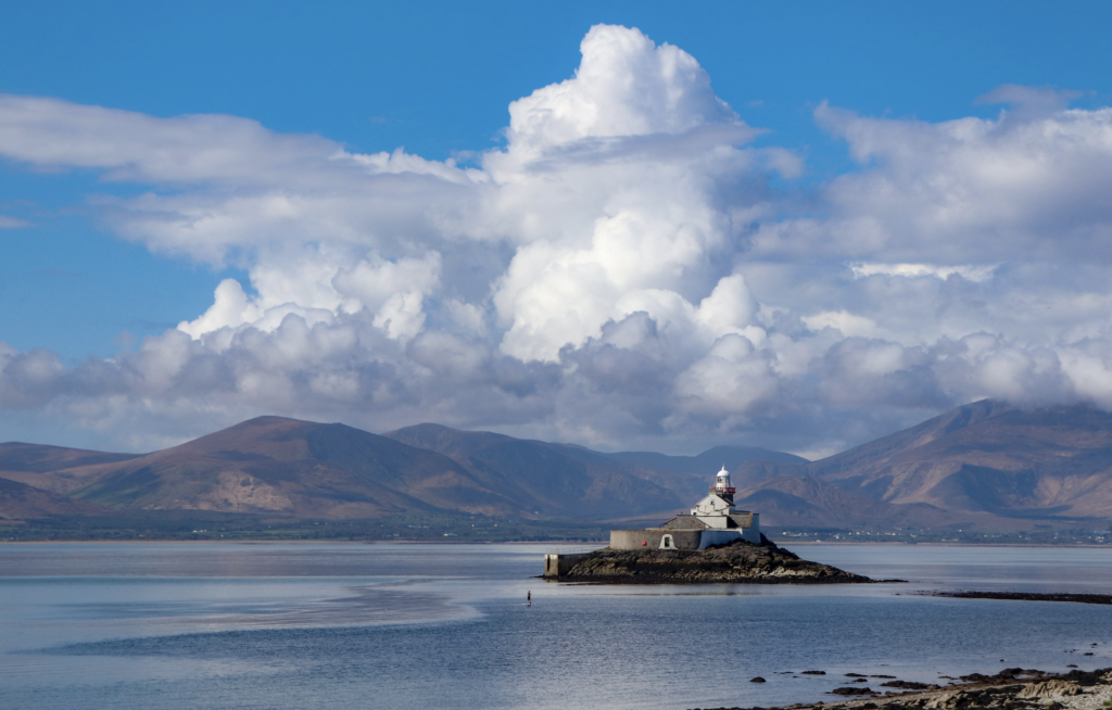 Fenit Lighthouse in Co. Kerry with the mountains of Slieve Mish in the backgroundThe mountains of Slieve Mish run through the eastern end of County Kerry’s Dingle peninsula and are responsible for Ireland’s highest mountain pass.