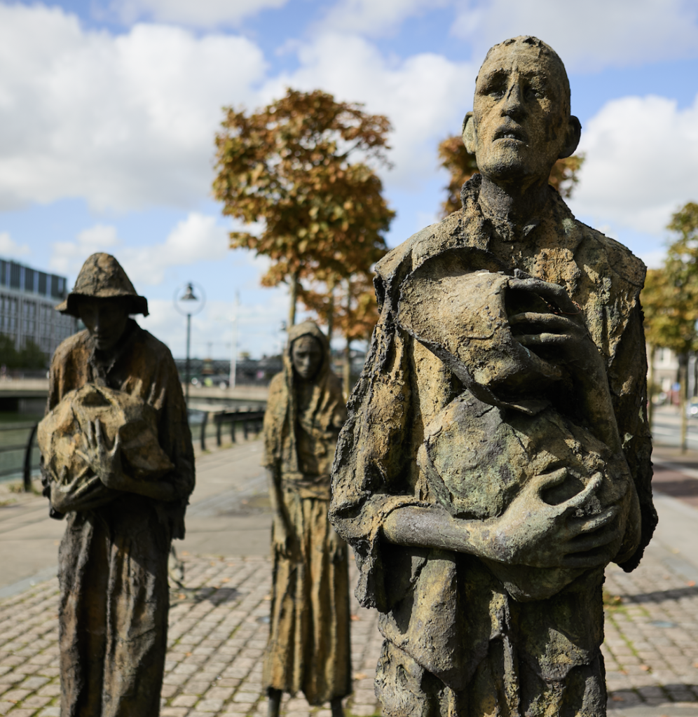 F is for the Famine Memorial. Rowan Gillespie’s gaunt bronze figures are stretched along the Liffey on the north quays of the River Liffey, at Custom House Quay, between the Custom House and Sean O’Casey Bridge. The figures, looking bent under hunger and loss, face towards the river and the ships that carried so many away. It is a deliberately unlovely scene. This is a reminder of starvation, exile, political failure and colonial misrule.